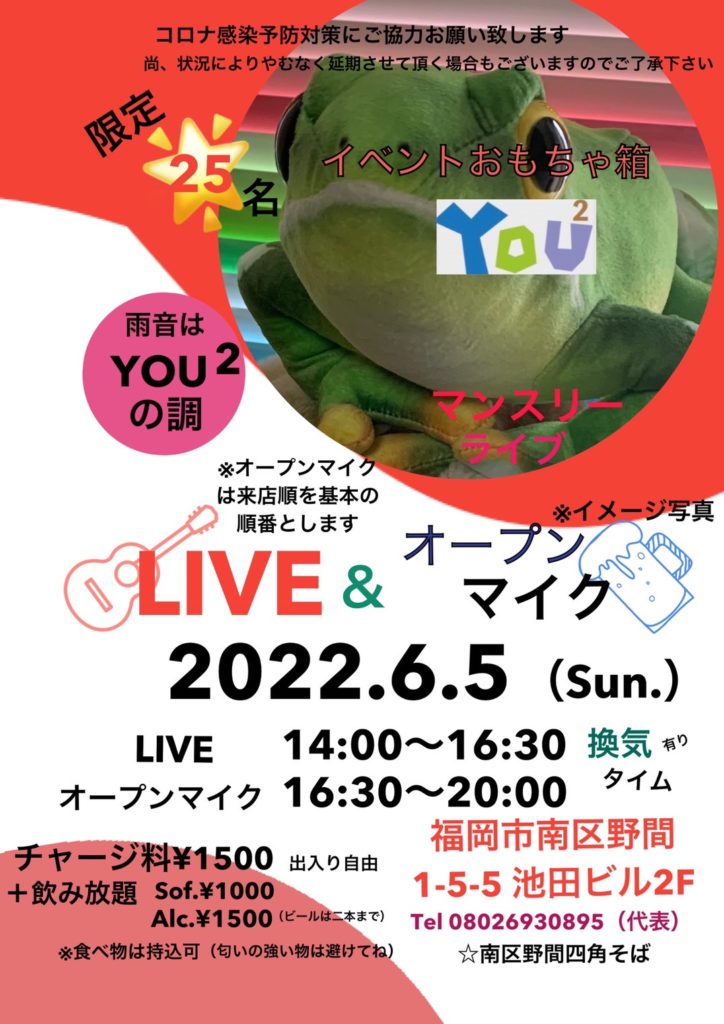 友&遊マンスリーライブ2022年6月 2022年5月28日 最終更新日時 : 2022年5月28日 youyou 6月5日、月恒例のマンスリーライブです。歌いたい方、演奏したい方、連絡お待ちしております。 Follow me! FacebooktwitterHatenaPocketCopy