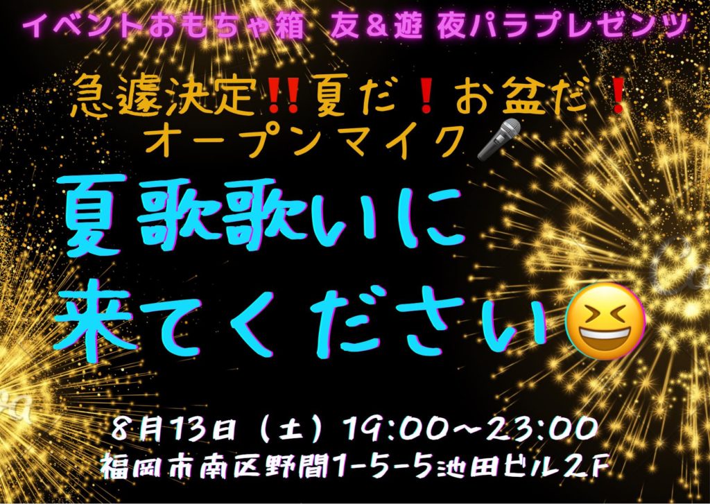 「精霊流し」「蒼い夏」「ひまわり」サザンにTUBEにその他色々、この時期ならではの夏歌を歌いにきませんか❓