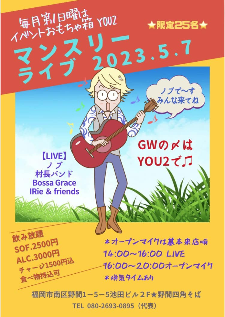 【ご案内】2023年5月マンスリーライブ 2023年4月25日 最終更新日時 : 2023年4月25日 youyou もうすぐGW 予定アリの方もそうでない方も、 最終日の日曜はYOU2マンスリーライブへ 明日への活力、養うぞ〜Oh♫ Follow me! FacebooktwitterHatenaPocketCopy